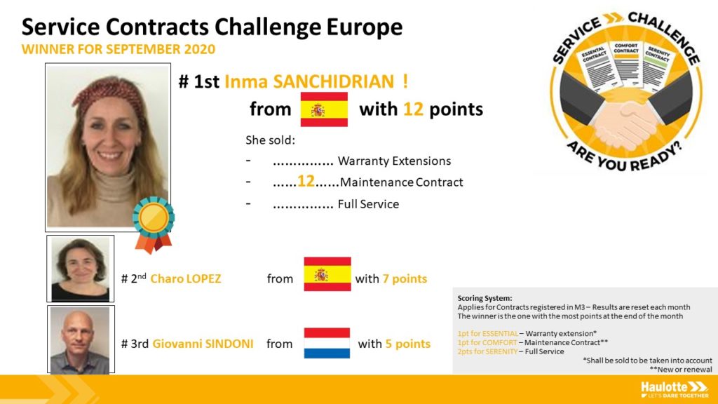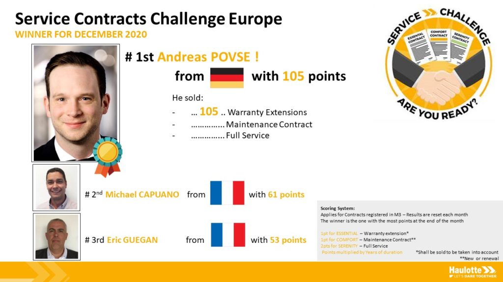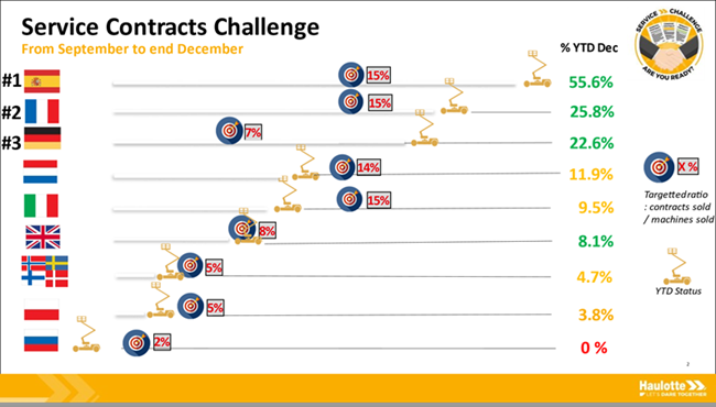 A l’issu de ce travail, les équipes « Haulotte Service » ont créé des Challenges sur la zone EUROPE, qui seront mis en place prochainement sur les zones APAC et AMERICAS. Les grands gagnants de ces challenges sont :