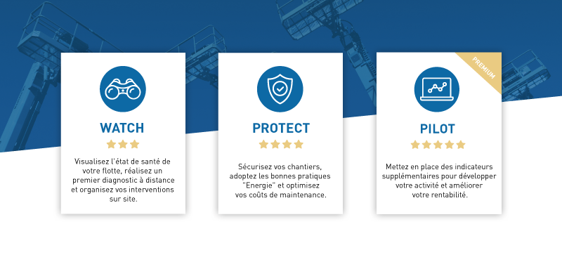 « Nous avons bâti une offre commerciale en fonction des différents types de besoins exprimés par nos clients. Cette dernière est vendue par abonnement, par machine, pour une durée d’engagement minimale de trois ans. Le premier niveau s’appelle WATCH, il s’adresse aux clients qui ont juste connaître la localisation, et le statut opérationnel des machines. C’est une vision en temps en réel de la machine. Le second niveau, PROTECT, leur permet d’optimiser la durée de vie des composants énergétiques telles que les batteries ou le filtre à particule. Il intègre également l’envoi d’alertes sur les comportements dangereux ou les échéances d’entretien des machines. Et enfin l’offre PILOT, réunit l’intégralité des fonctions disponibles avec notamment la gestion des plages horaires d’utilisation, la délimitation des zones de travail, l’usage détaillé des machines, l’accès aux rapports et aux historiques». Christophe Lacaze