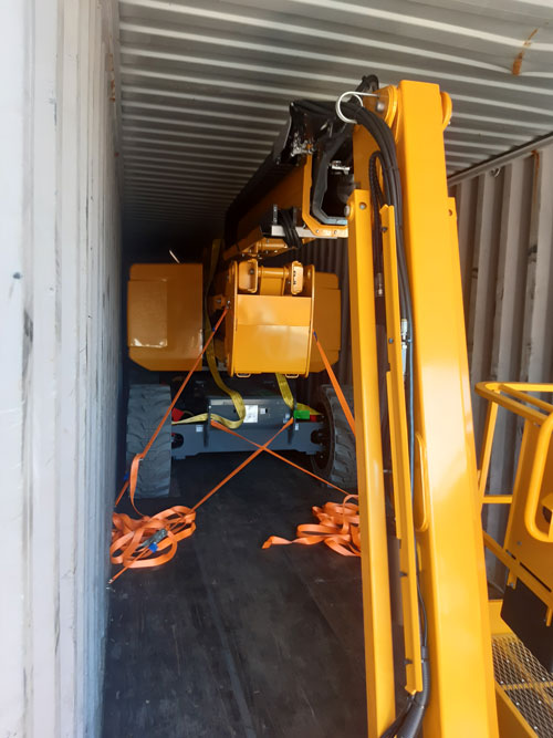 Trois types de machines sont expédiées par container : les nacelles ciseaux HS15 et 18 E et les nacelles HA20LE PRO et HA20RTJ PRO. Elles nécessitent une préparation spécifique. Pour les ciseaux, il faut plier les gardes corps et sangler la plateforme. Nous pouvons mettre deux nacelles HS15 et 18 E dans un container. Les machines HA20LE PRO et HA20RTJ PRO sont plus larges que les containers. Nous devons donc retourner les quatre roues pour qu’elles puissent rentrer. Il faut également activer une option dans l’Activ’Screen pour empêcher la flèche de se déplier puis sangler la flèche. Nous ne pouvons mettre qu’une seule machine HA20 par container.