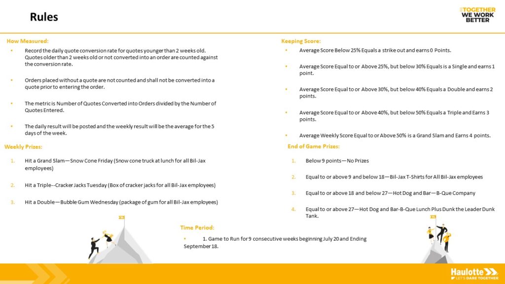 Suite aux bouleversements liés à la pandémie de Covid-19, l’équipe a cherché des moyens d’améliorer ses ventes en convertissant davantage de devis en commandes fermes. Pour joindre l’utile à l’agréable, l’équipe a créé un jeu de baseball lui permettant de garder en permanence son objectif à l’esprit,